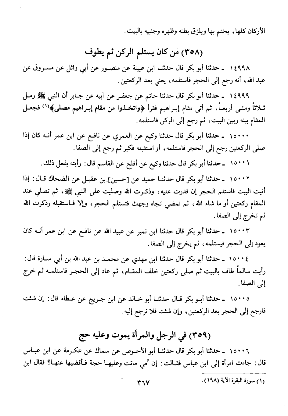 15000 - أَبُو بَكْرٍ قَالَ: حَدَّثَنَا وَكِيعٌ عَنِ الْعُمَرِيِّ عَنْ نَافِعٍ عَنِ ابْنِ عُمَرَ «أَنَّهُ §كَانَ إِذَا صَلَّى الرَّكْعَتَيْنِ رَجِعَ إِلَى الْحَجَرِ فَاسْتَلَمَهُ أَوِ اسْتَقْبَلَهُ فَكَبَّرَ ثُمَّ رَجِعَ إِلَى الصَّفَا» حَدَّثَنَا