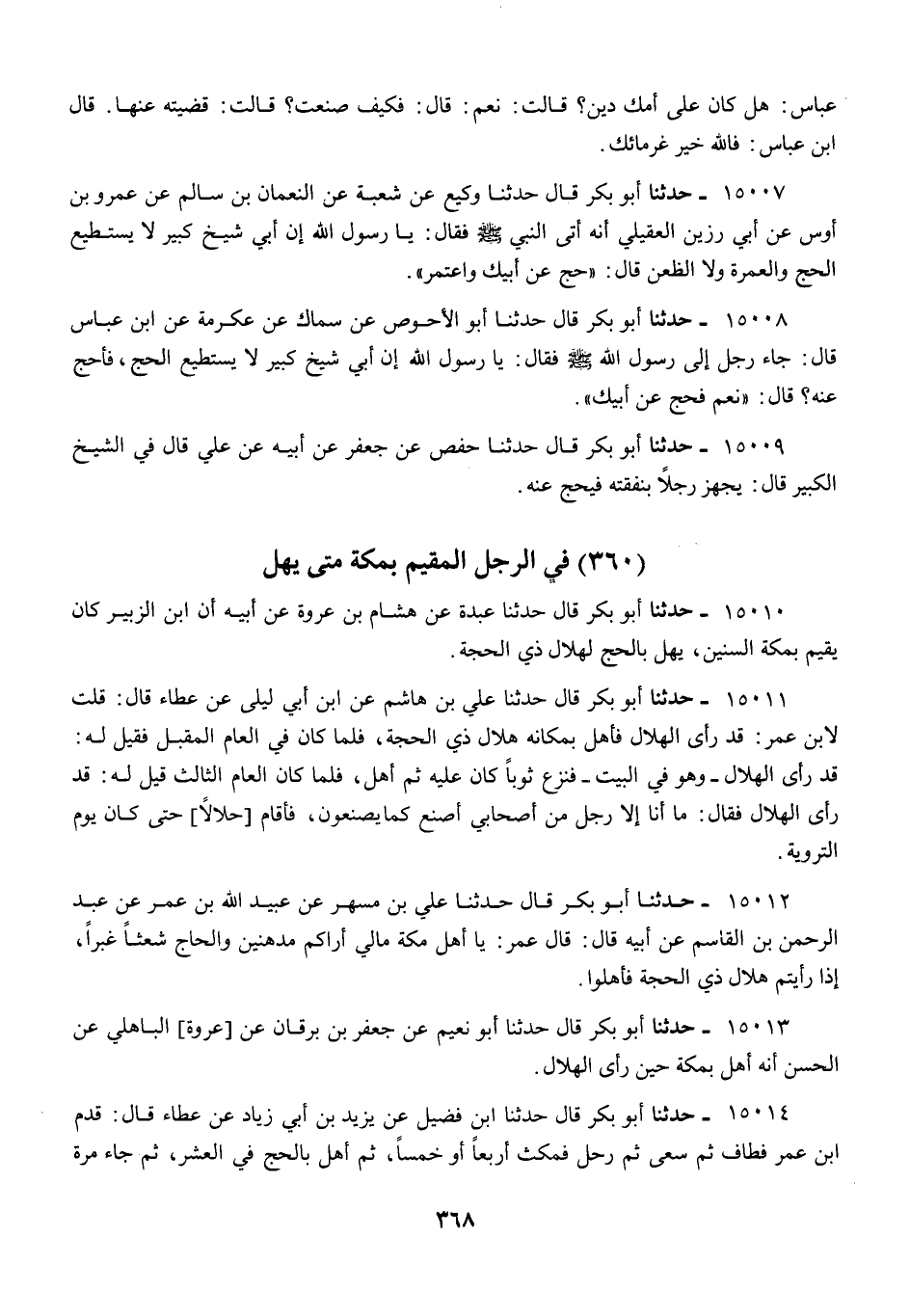 15010 - أَبُو بَكْرٍ قَالَ: حَدَّثَنَا عَبْدَةُ، عَنْ هِشَامِ بْنِ عُرْوَةَ، عَنْ أَبِيهِ، أَنَّ ابْنَ الزُّبَيْرِ، «كَانَ §يُقِيمُ بِمَكَّةَ السِّنِينَ، يُهِلُّ بِالْحَجِّ لِهِلَالِ ذِي الْحِجَّةِ»