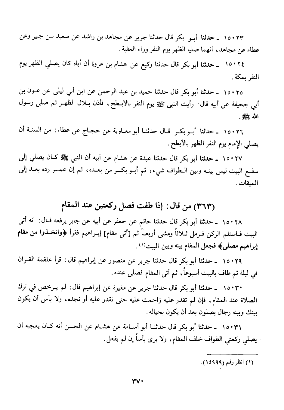 15030 - أَبُو بَكْرٍ قَالَ: حَدَّثَنَا جَرِيرٌ، عَنْ مُغِيرَةَ، عَنْ إِبْرَاهِيمَ قَالَ: «§لَمْ يُرَخِّصْ فِي تَرْكِ الصَّلَاةِ عِنْدَ الْمَقَامِ، فَإِنْ لَمْ تَقْدِرْ عَلَيْهِ زَاحَمْتُ عَلَيْهِ حَتَّى تَقْدِرَ عَلَيْهِ أَوْ تَجِدَهُ، وَلَا بَأْسَ أَنْ يَكُونَ بَيْنَكَ وَبَيْنَهُ رِجَالٌ يُصَلُّونَ بَعْدَ أَنْ يَكُونَ بِحِيَالِهِ»