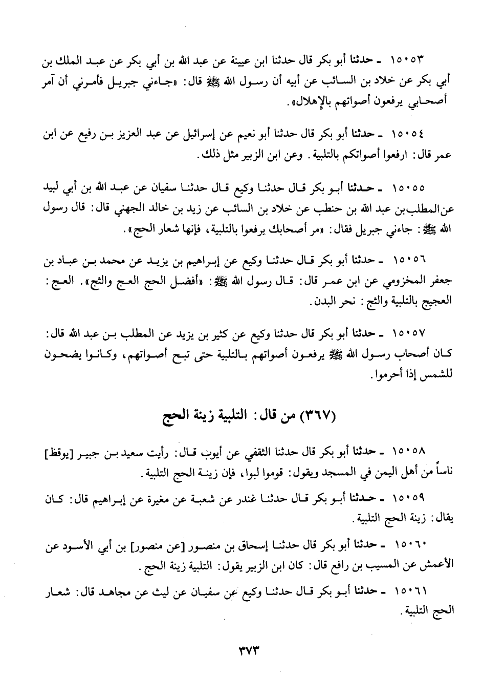 15058 - أَبُو بَكْرٍ قَالَ: حَدَّثَنَا الثَّقَفِيُّ، عَنْ أَيُّوبَ قَالَ: رَأَيْتُ سَعِيدَ بْنَ جُبَيْرٍ يُوقِظُ نَاسًا مِنْ أَهْلِ الْيَمَنِ فِي الْمَسْجِدِ، وَيَقُولُ: «§قُومُوا لَبُّوا، فَإِنَّ زِينَةَ الْحَجِّ التَّلْبِيَةُ»