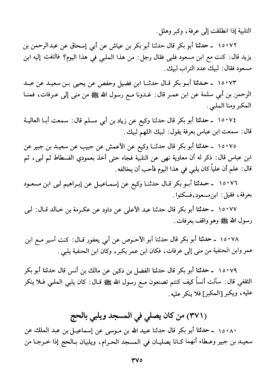 15073 - أَبُو بَكْرٍ قَالَ: حَدَّثَنَا ابْنُ فُضَيْلٍ، وَحَفْصٌ، عَنْ يَحْيَى بْنِ سَعِيدٍ، عَنْ عَبْدِ الرَّحْمَنِ بْنِ أَبِي سَلَمَةَ، عَنِ ابْنِ عُمَرَ قَالَ: «§غَدَوْنَا مَعَ رَسُولِ اللَّهِ صَلَّى اللهُ عَلَيْهِ وَسَلَّمَ مِنْ مِنًى إِلَى عَرَفَاتٍ، فَمِنَّا الْمُكَبِّرُ وَمِنَّا الْمُلَبِّي»
