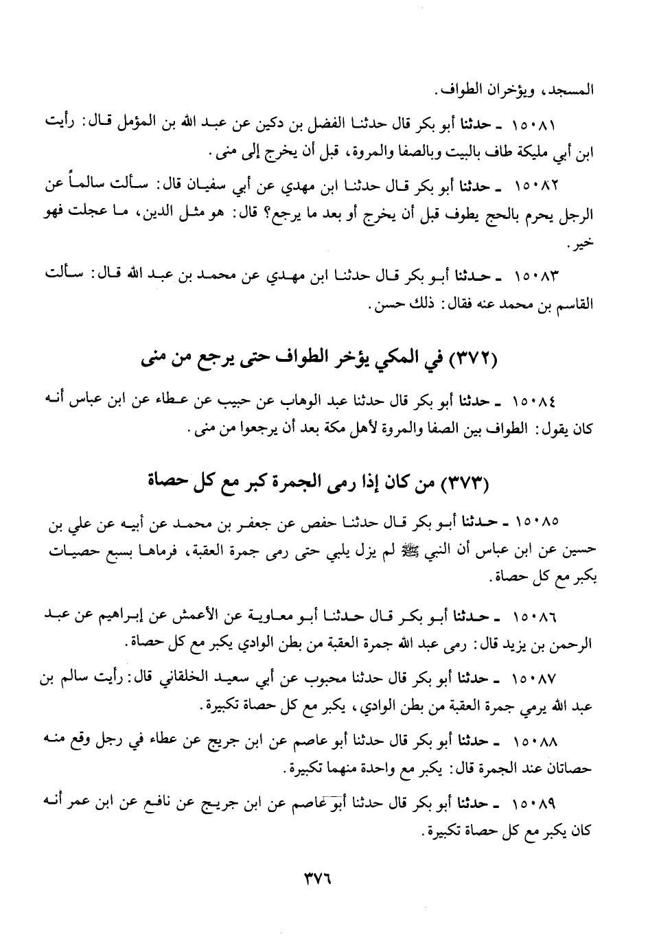 15086 - أَبُو بَكْرٍ قَالَ: حَدَّثَنَا أَبُو مُعَاوِيَةَ، عَنِ الْأَعْمَشِ، عَنْ إِبْرَاهِيمَ، عَنْ عَبْدِ الرَّحْمَنِ بْنِ يَزِيدَ قَالَ: «§رَمَى عَبْدُ اللَّهِ جَمْرَةَ الْعَقَبَةِ مِنْ بَطْنِ الْوَادِي يُكَبِّرُ مَعَ كُلِّ حَصَاةٍ»