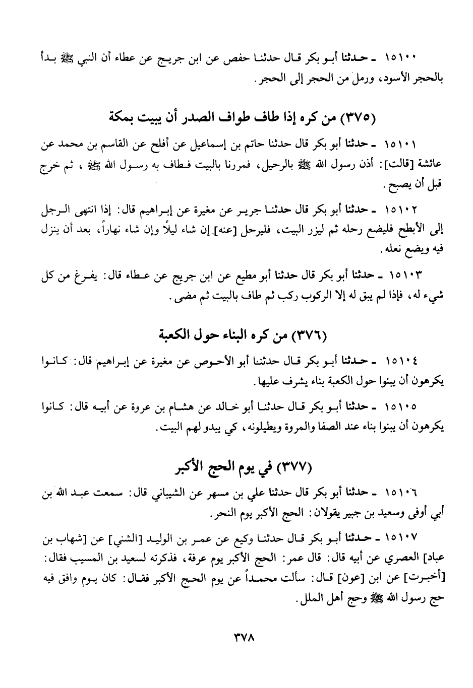 15108 - أَبُو بَكْرٍ قَالَ: حَدَّثَنَا وَكِيعٌ، عَنْ سُفْيَانَ، عَنْ أَبِي إِسْحَاقَ قَالَ: سَأَلْتُ عَبْدَ اللَّهِ بْنَ شَدَّادٍ، عَنِ الْحَجِّ الْأَكْبَرِ فَقَالَ: «§الْحَجُّ الْأَكْبَرُ يَوْمُ النَّحْرِ»
