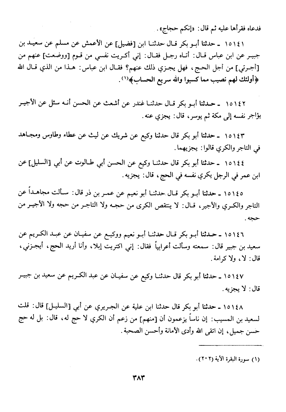 15146 - أَبُو بَكْرٍ قَالَ: حَدَّثَنَا أَبُو نُعَيْمٍ، وَوَكِيعٌ، عَنْ سُفْيَانَ، عَنْ عَبْدِ الْكَرِيمِ، عَنْ سَعِيدِ بْنِ جُبَيْرٍ قَالَ: سَمِعْتُهُ وَسَأَلْتُ أَعْرَابِيًّا فَقَالَ: إِنِّي §اكْتَرَيْتُ إِبِلًا، وَأَنَا أُرِيدُ الْحَجَّ أَيُجْزِئُنِي؟ قَالَ: «لَا وَلَا كَرَامَةَ»