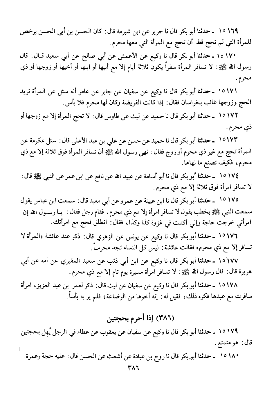15170 - أَبُو بَكْرٍ قَالَ: نا وَكِيعٌ، عَنِ الْأَعْمَشِ، عَنْ أَبِي صَالِحٍ، عَنْ أَبِي سَعِيدٍ قَالَ: قَالَ رَسُولُ اللَّهِ صَلَّى اللهُ عَلَيْهِ وَسَلَّمَ: «§لَا تُسَافِرُ الْمَرْأَةُ سَفَرًا يَكُونُ ثَلَاثَةَ أَيَّامٍ إِلَّا مَعَ أَبِيهَا، أَوِ ابْنِهَا، أَوْ أَخِيهَا، أَوْ زَوْجِهَا، أَوْ ذِي مَحْرَمٍ»