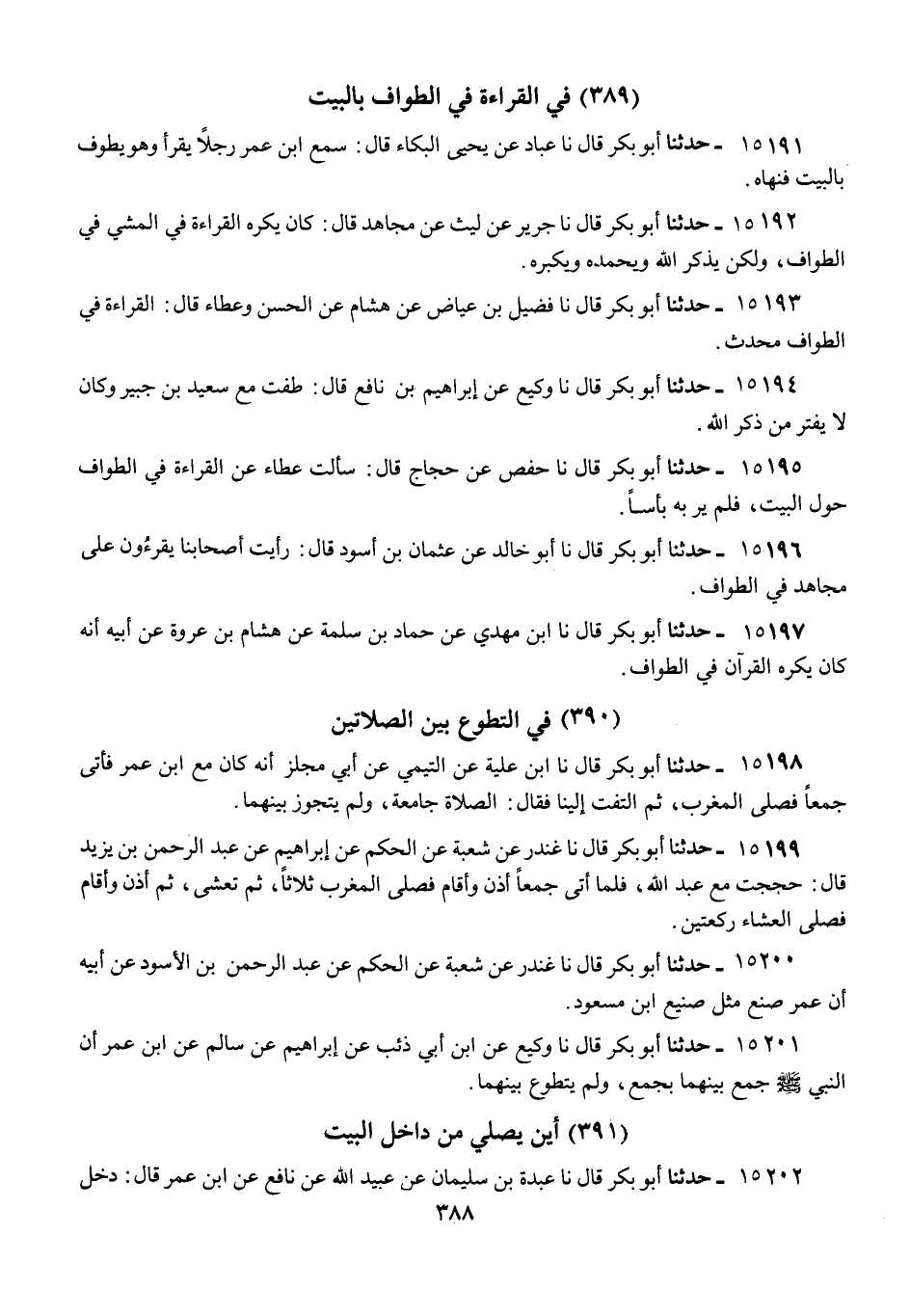 15191 - أَبُو بَكْرٍ قَالَ: نا عَبَّادٌ، عَنْ يَحْيَى الْبَكَّاءِ قَالَ: «§سَمِعَ ابْنُ عُمَرَ رَجُلًا يَقْرَأُ وَهُوَ يَطُوفُ بِالْبَيْتِ، فَنَهَاهُ»