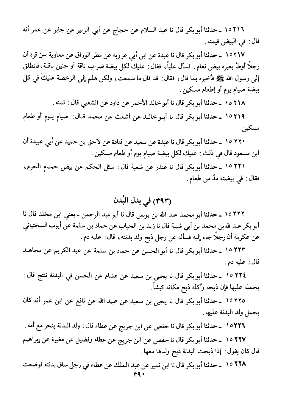 15217 - أَبُو بَكْرٍ قَالَ: نا عَبْدَةُ، عَنِ ابْنِ أَبِي عَرُوبَةَ، عَنْ مَطَرٍ الْوَرَّاقِ، عَنْ مُعَاوِيَةَ بْنِ قُرَّةَ، أَنَّ رَجُلًا أَوْطَأَ بَعِيرَهُ بَيْضَ نَعَامٍ، فَسَأَلَ عَلِيًّا، فَقَالَ: عَلَيْكَ لِكُلِّ بَيْضَةٍ صِرَابُ نَاقَتِهِ أَوْ حَبْنُ نَاقَتِهِ، فَانْطَلَقَ إِلَى رَسُولِ اللَّهِ صَلَّى اللهُ عَلَيْهِ وَسَلَّمَ فَأَخْبَرَهُ بِمَا قَالَ، فَقَالَ: «قَدْ قَالَ مَا سَمِعْتَ، §عَلَيْكَ فِي كُلِّ بَيْضَةٍ صِيَامُ يَوْمٍ، أَوْ إِطْعَامُ مِسْكِينٍ»