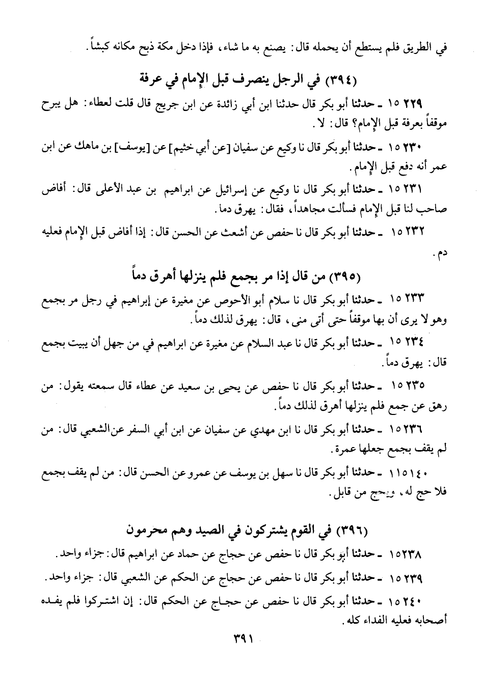 15231 - أَبُو بَكْرٍ قَالَ: نا وَكِيعٌ، عَنْ إِسْرَائِيلَ، عَنْ إِبْرَاهِيمَ بْنِ عَبْدِ الْأَعْلَى قَالَ: أَفَاضَ صَاحِبٌ لَنَا قَبْلَ الْإِمَامِ. فَسَأَلْتُ مُجَاهِدًا فَقَالَ: «§يُهْرِقُ دَمًا»