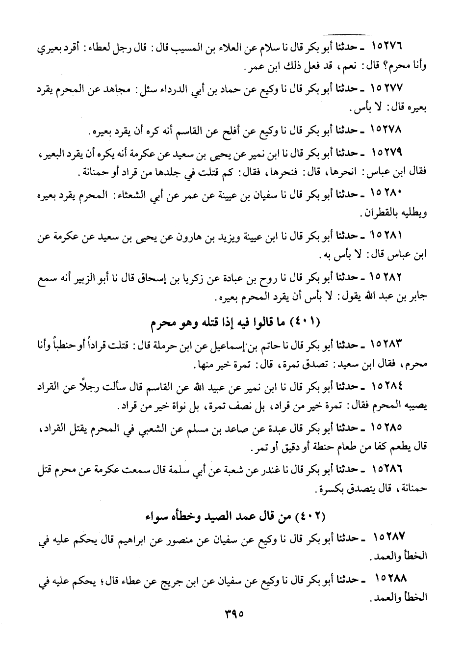 15277 - أَبُو بَكْرٍ قَالَ: نا وَكِيعٌ، عَنْ حَمَّادِ بْنِ أَبِي الدَّرْدَاءِ، سُئِلَ: مُجَاهِدٌ عَنِ الْمُحْرِمِ يُقَرِّدُ بَعِيرَهُ، قَالَ: «§لَا بَأْسَ»