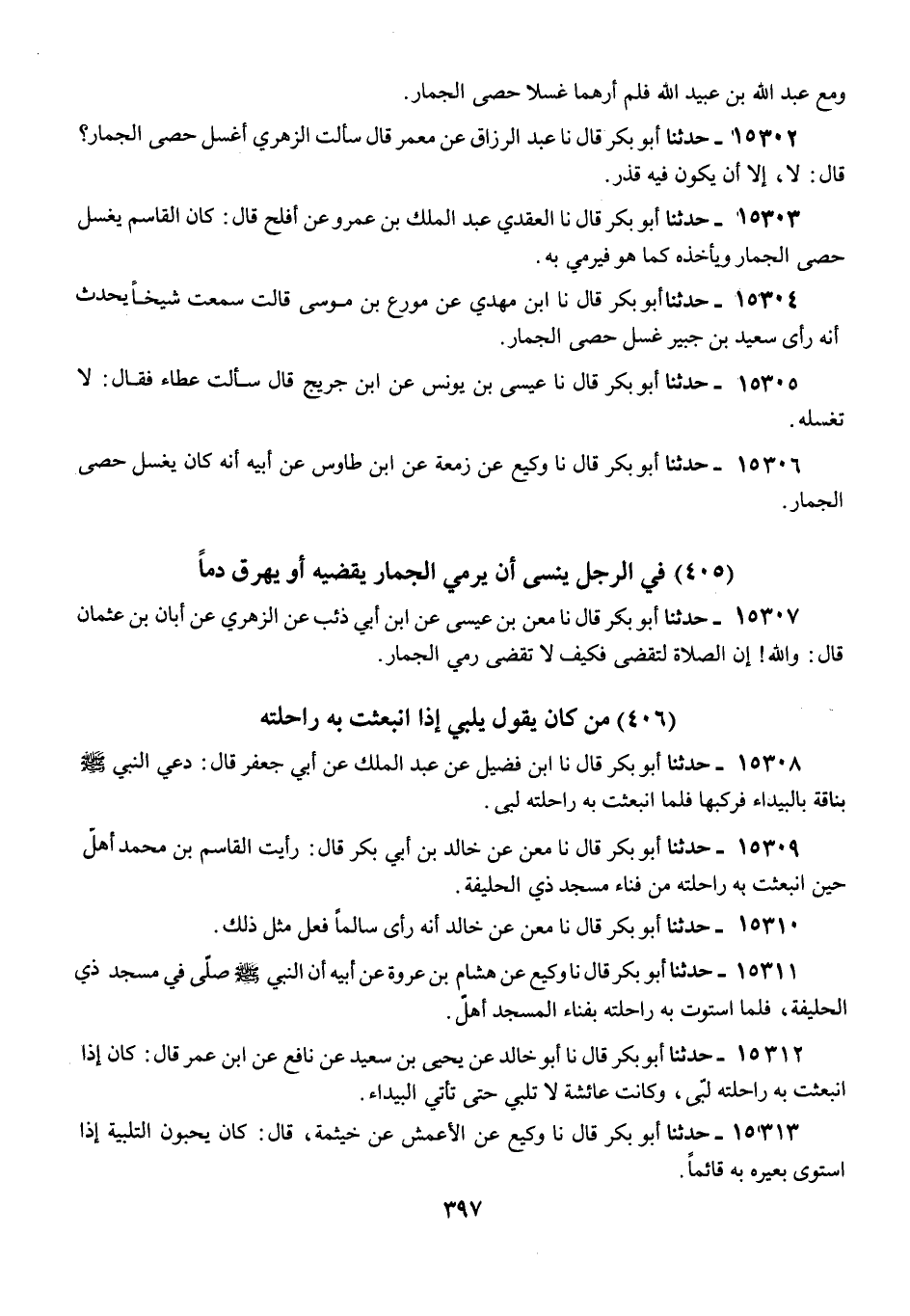 15303 - أَبُو بَكْرٍ قَالَ: نا الْعَقَدِيُّ عَبْدُ الْمَلِكِ بْنُ عَمْرٍو، عَنْ أَفْلَحَ قَالَ: كَانَ الْقَاسِمُ §يَغْسِلُ حَصَى الْجِمَارِ، وَيَأْخُذُهُ كَمَا هُوَ فَيَرْمِي بِهِ "