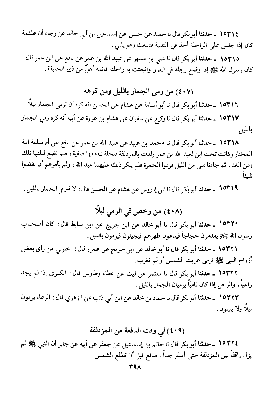 15319 - أَبُو بَكْرٍ قَالَ: نا ابْنُ إِدْرِيسَ، عَنْ هِشَامٍ، عَنِ الْحَسَنِ قَالَ: «§لَا تُرْمَى الْجِمَارُ بِاللَّيْلِ»