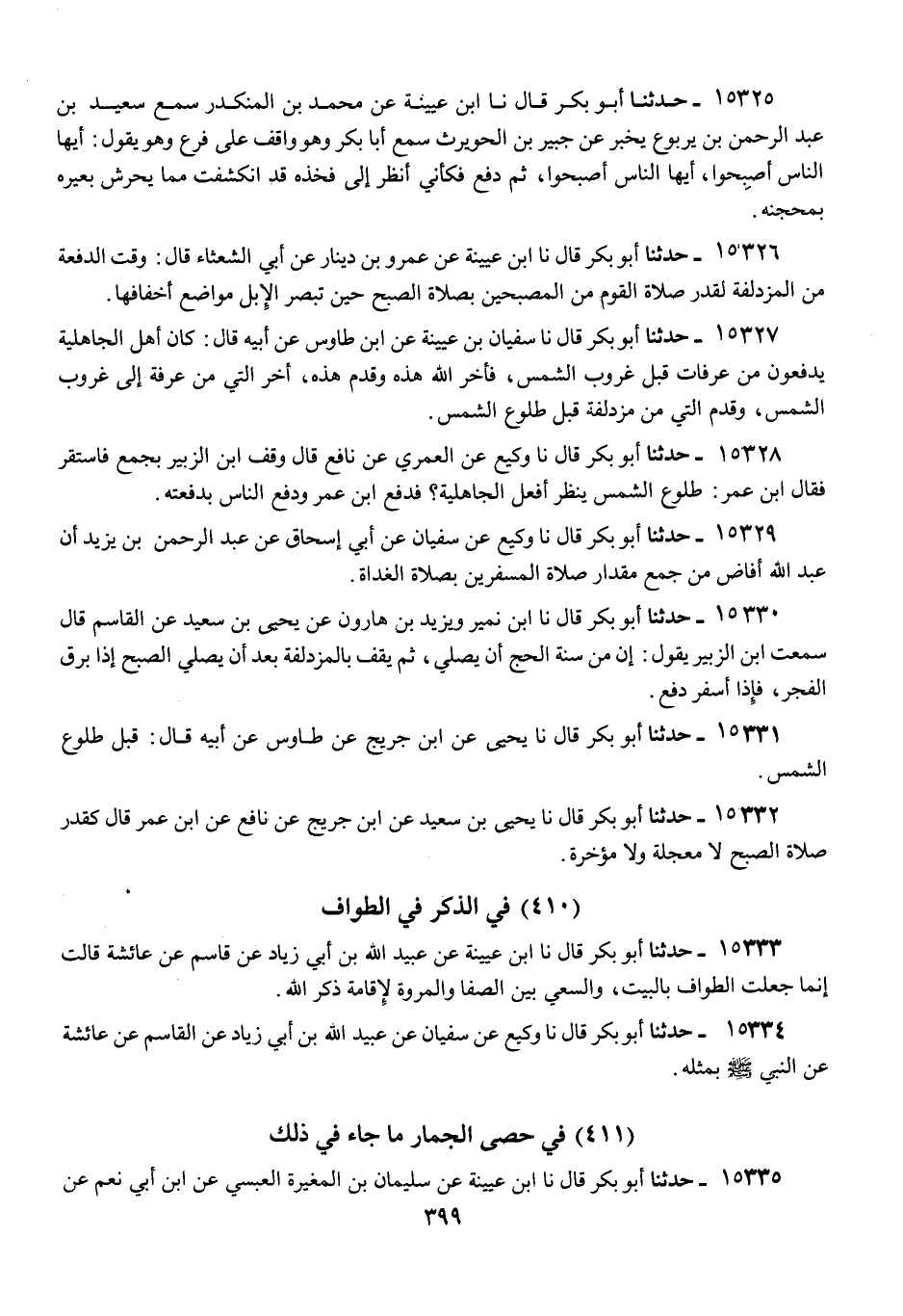 15329 - أَبُو بَكْرٍ قَالَ: نا وَكِيعٌ، عَنْ سُفْيَانَ، عَنْ أَبِي إِسْحَاقَ، عَنْ عَبْدِ الرَّحْمَنِ بْنِ يَزِيدَ: أَنَّ عَبْدَ اللَّهِ «§أَفَاضَ مِنْ جَمْعٍ مِقْدَارَ صَلَاةِ الْمُسْفِرِينَ بِصَلَاةِ الْغَدَاةِ»
