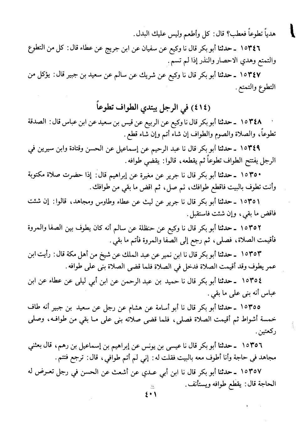15357 - أَبُو بَكْرٍ قَالَ: نا ابْنُ أَبِي عَدِيٍّ، عَنْ أَشْعَثَ، عَنِ الْحَسَنِ، فِي رَجُلٍ تَعْرِضُ لَهُ الْحَاجَةُ، قَالَ: «§يَقْطَعُ طَوَافَهُ وَيَسْتَأْنِفُ»