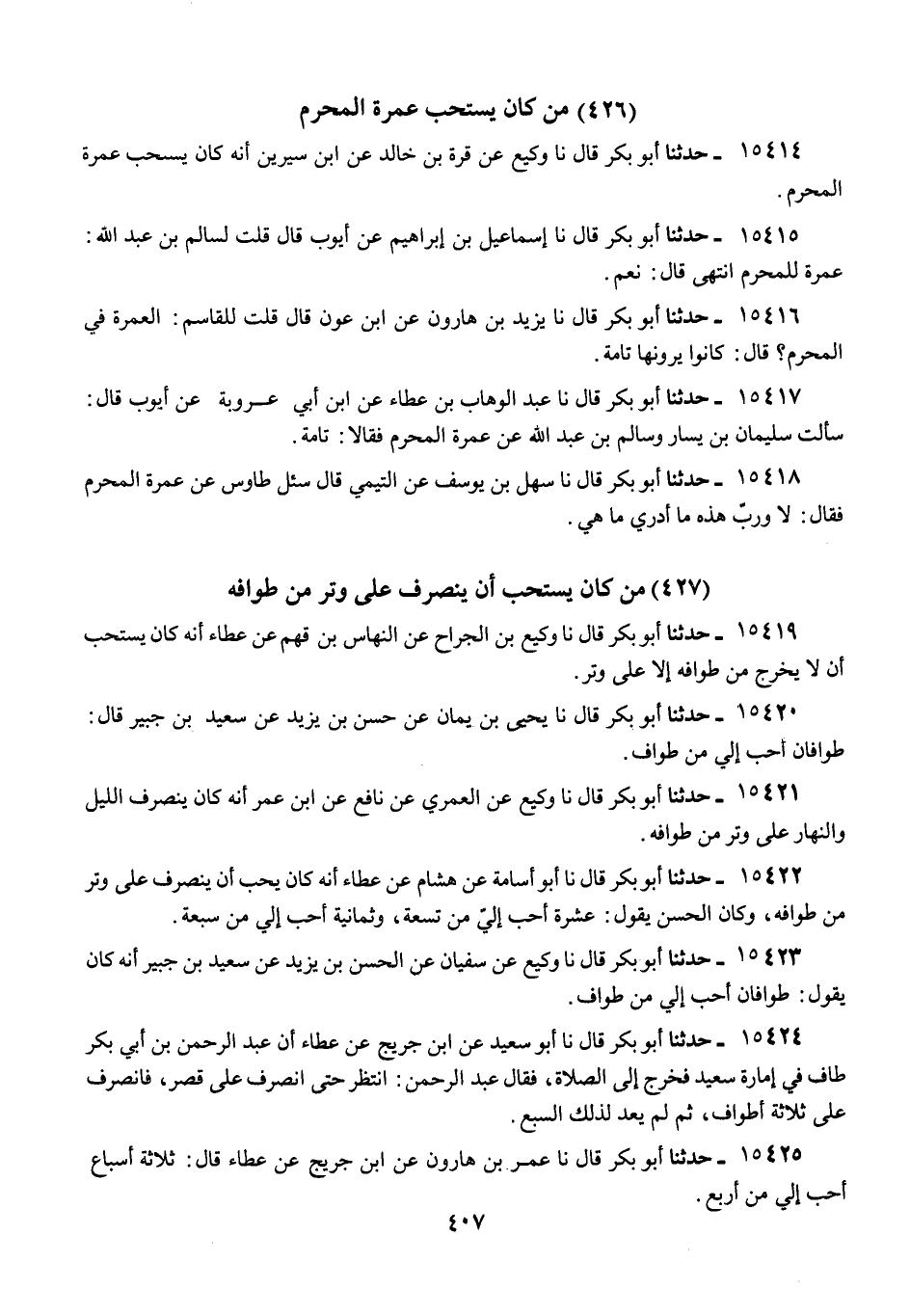 15421 - أَبُو بَكْرٍ قَالَ: نا وَكِيعٌ، عَنِ الْعُمَرِيِّ، عَنْ نَافِعٍ، عَنِ ابْنِ عُمَرَ أَنَّهُ كَانَ: «§يَنْصَرِفُ اللَّيْلَ وَالنَّهَارَ عَلَى وِتْرٍ مِنْ طَوَافِهِ»