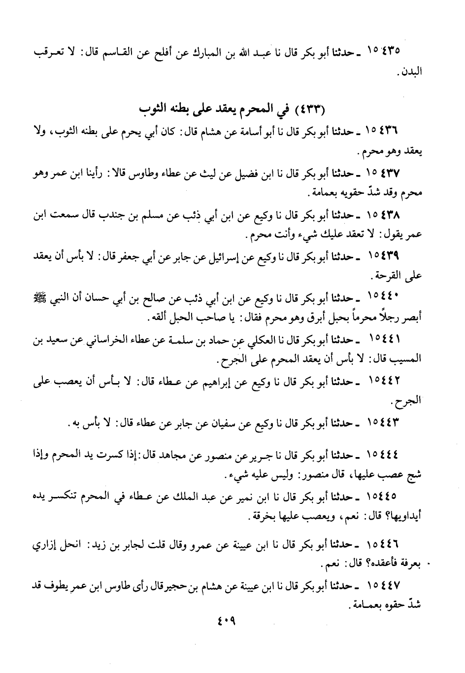 15436 - أَبُو بَكْرٍ قَالَ: نا أَبُو أُسَامَةَ، عَنْ هِشَامٍ قَالَ: «كانَ §أَبِي يُحْرِمُ عَلَى بَطْنِهِ الثَّوْبَ، وَلَا يَعْقِدُ وَهُوَ مُحْرِمٌ»