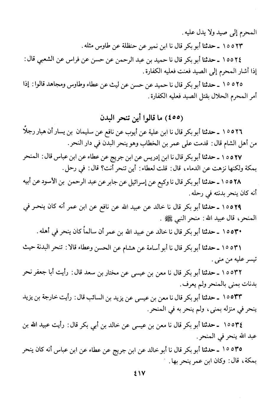 15526 - أَبُو بَكْرٍ قَالَ: نا ابْنُ عُلَيَّةَ، عَنْ أَيُّوبَ، عَنْ نَافِعٍ، عَنْ سُلَيْمَانَ بْنِ يَسَارٍ أَنَّ هَبَّارًا، رَجُلًا مِنْ أَهْلِ الشَّامِ قَالَ: «قَدِمْتُ عَلَى عُمَرَ بْنِ الْخَطَّابِ وَهُوَ §يَنْحَرُ الْبُدْنَ فِي دَارِ النَّحْرِ»