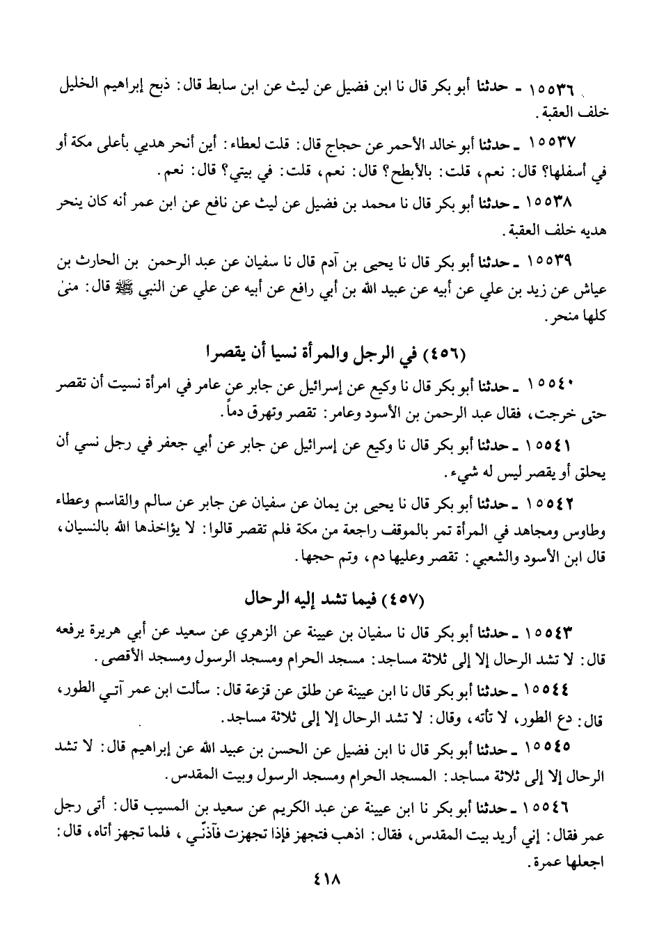 15545 - أَبُو بَكْرٍ قَالَ: نا ابْنُ فُضَيْلٍ، عَنِ الْحَسَنِ بْنِ عُبَيْدِ اللَّهِ، عَنْ إِبْرَاهِيمَ قَالَ: " §لَا تُشَدُّ الرِّحَالُ إِلَّا إِلَى ثَلَاثَةِ مَسَاجِدَ: الْمَسْجِدِ الْحَرَامِ، وَمَسْجِدِ الرَّسُولِ، وَبَيْتِ الْمَقْدِسِ "