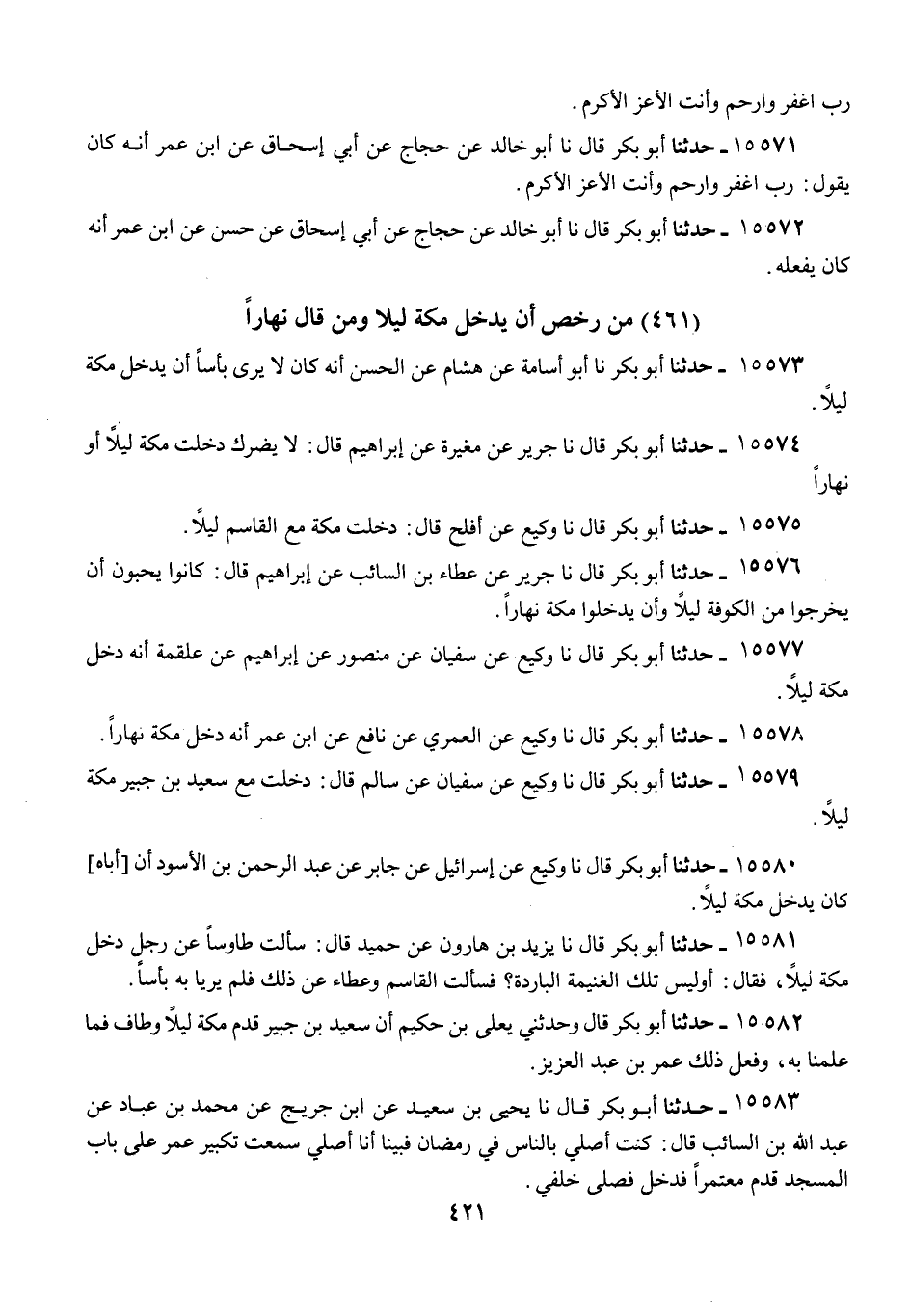 15574 - أَبُو بَكْرٍ قَالَ: نا جَرِيرٌ، عَنْ مُغِيرَةَ، عَنْ إِبْرَاهِيمَ قَالَ: «§لَا يَضُرُّكَ دَخَلْتَ مَكَّةَ لَيْلًا أَوْ نَهَارًا»