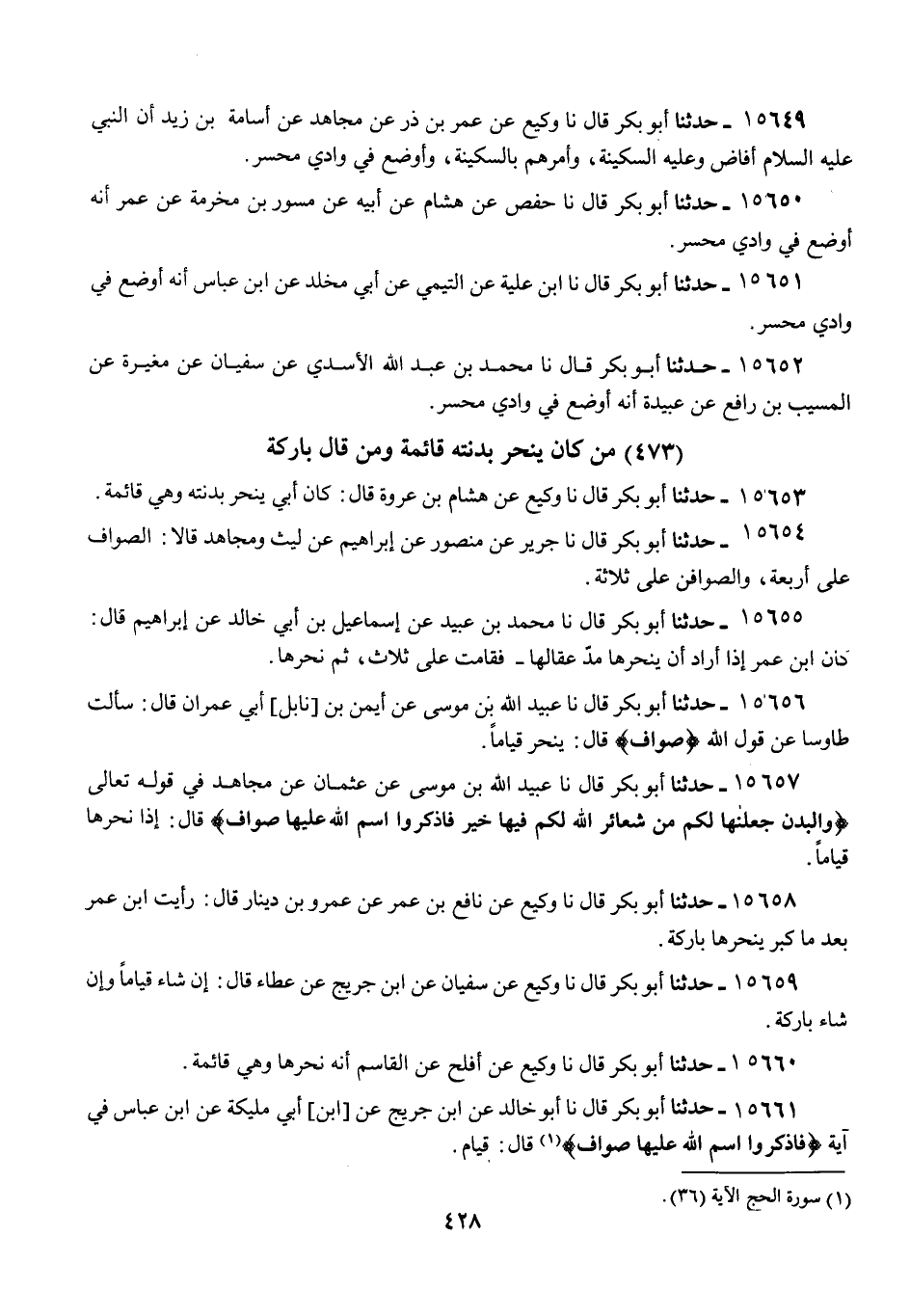 15656 - أَبُو بَكْرٍ قَالَ: نا عُبَيْدُ اللَّهِ بْنُ مُوسَى، عَنْ أَيْمَنَ بْنِ نَائِلٍ أَبِي عِمْرَانَ، قَالَ: سَأَلْتُ طَاوُسًا عَنْ قَوْلِ اللَّهِ {§صَوَافَّ} [الحج: 36] قَالَ: «يَنْحَرُ قِيَامًا»