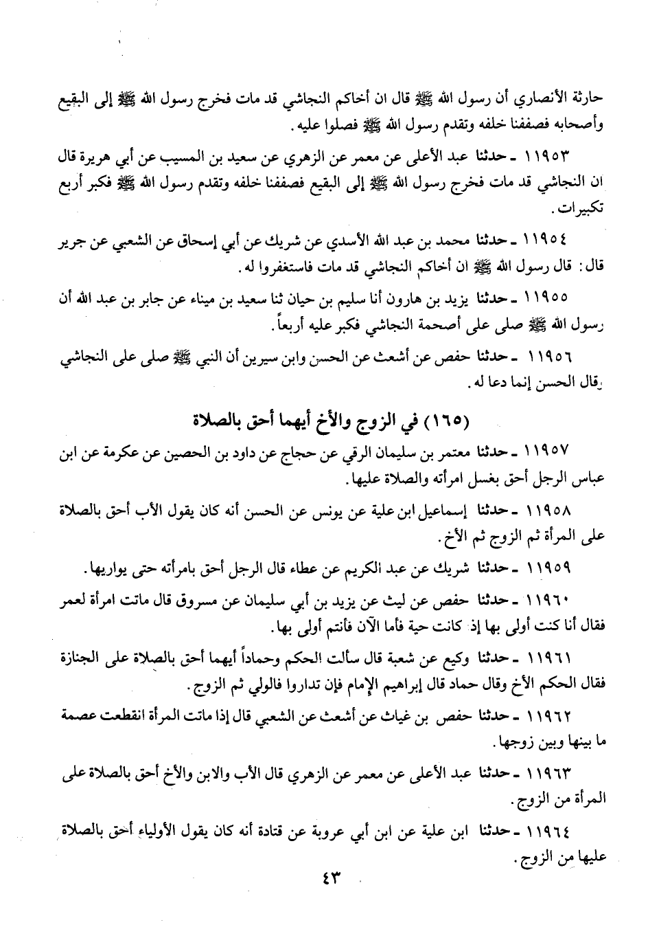 11955 - حَدَّثَنَا يَزِيدُ بْنُ هَارُونَ، أَنَا سَلِيمُ بْنُ حَيَّانَ، ثنا سَعِيدُ بْنُ مِينَاءَ، عَنْ جَابِرِ بْنِ عَبْدِ اللَّهِ، أَنَّ رَسُولَ اللَّهِ صَلَّى اللهُ عَلَيْهِ وَسَلَّمَ «§صَلَّى عَلَى أَصْحَمَةَ النَّجَاشِيِّ فَكَبَّرَ عَلَيْهِ أَرْبَعًا»