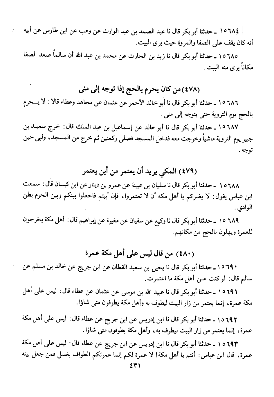 15689 - أَبُو بَكْرٍ قَالَ: نا وَكِيعٌ، عَنْ سُفْيَانَ، عَنْ مُغِيرَةَ، عَنْ إِبْرَاهِيمَ قَالَ: «§أَهْلُ مَكَّةَ يَخْرُجُونَ لِلْعُمْرَةِ، وَيُهِلُّونَ بِالْحَجِّ مِنْ مَكَانِهِمْ»