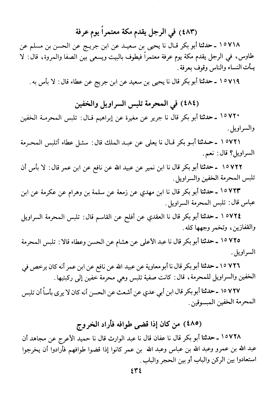 15720 - أَبُو بَكْرٍ قَالَ: نا جَرِيرٌ، عَنْ مُغِيرَةَ، عَنْ إِبْرَاهِيمَ قَالَ: «§تَلْبَسُ الْمُحْرِمَةُ الْخُفَّيْنِ وَالسَّرَاوِيلَ»