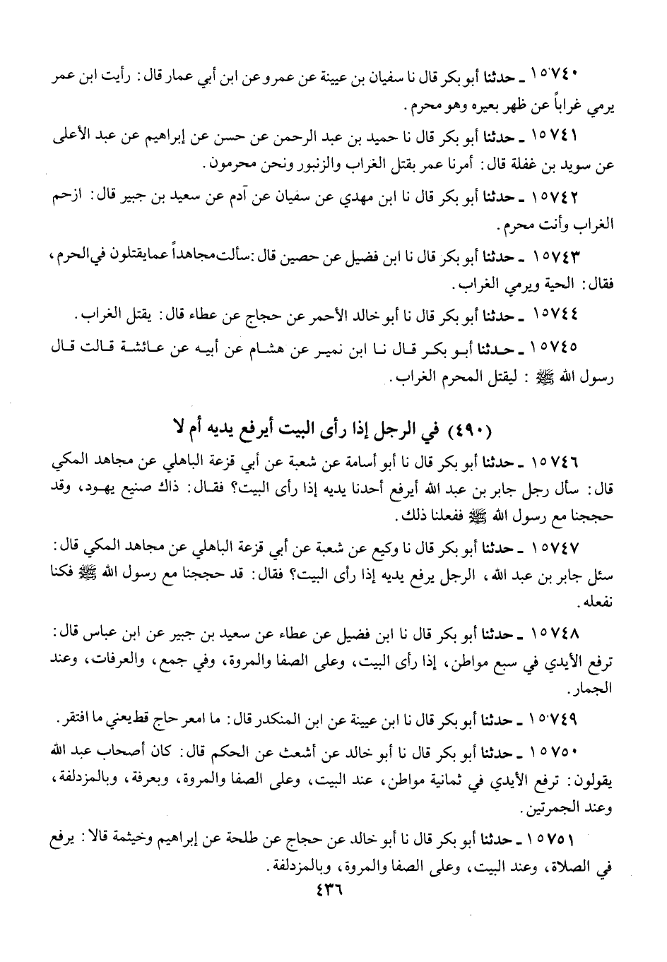 15742 - أَبُو بَكْرٍ قَالَ: نا ابْنُ مَهْدِيٍّ، عَنْ سُفْيَانَ، عَنْ آدَمَ، عَنْ سَعِيدِ بْنِ جُبَيْرٍ قَالَ: «§ارْجُمِ الْغُرَابَ وَأَنْتَ مُحْرِمٌ»
