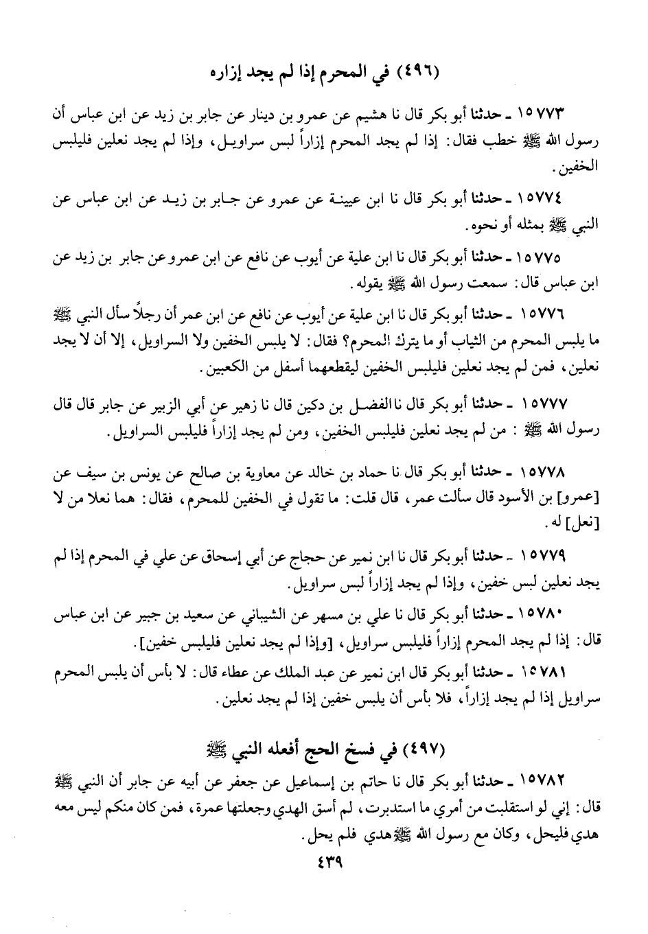 15779 - أَبُو بَكْرٍ قَالَ: نا ابْنُ نُمَيْرٍ، عَنْ حَجَّاجٍ، عَنْ أَبِي إِسْحَاقَ، عَنْ عَلِيٍّ «§فِي الْمُحْرِمِ إِذَا لَمْ يَجِدْ نَعْلَيْنِ لَبِسَ خُفَّيْنِ، وَإِذَا لَمْ يَجِدْ إِزَارًا لَبِسَ سَرَاوِيلَ»