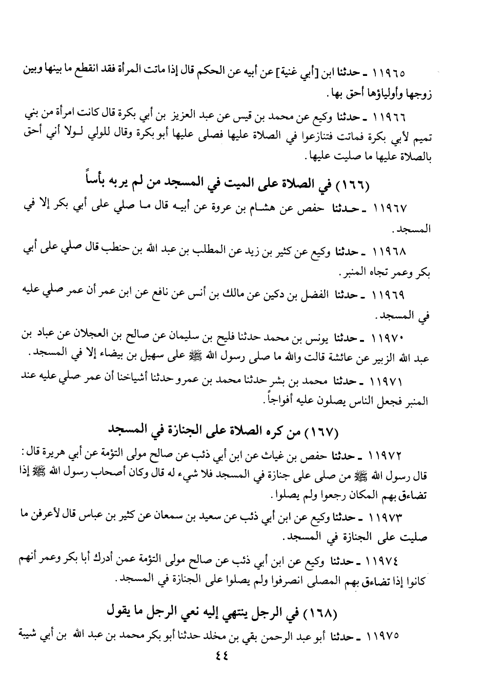 11967 - حَدَّثَنَا حَفْصٌ، عَنْ هِشَامِ بْنِ عُرْوَةَ، عَنْ أَبِيهِ، قَالَ: «§مَا صُلِّيَ عَلَى أَبِي بَكْرٍ إِلَّا فِي الْمَسْجِدِ»