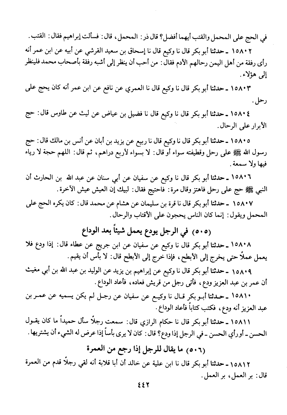 15803 - أَبُو بَكْرٍ قَالَ: نا وَكِيعٌ، قَالَ: نا الْعُمَرِيُّ، عَنْ نَافِعٍ، عَنِ ابْنِ عُمَرَ «أَنَّهُ كَانَ §يَحُجُّ عَلَى رَحْلٍ»