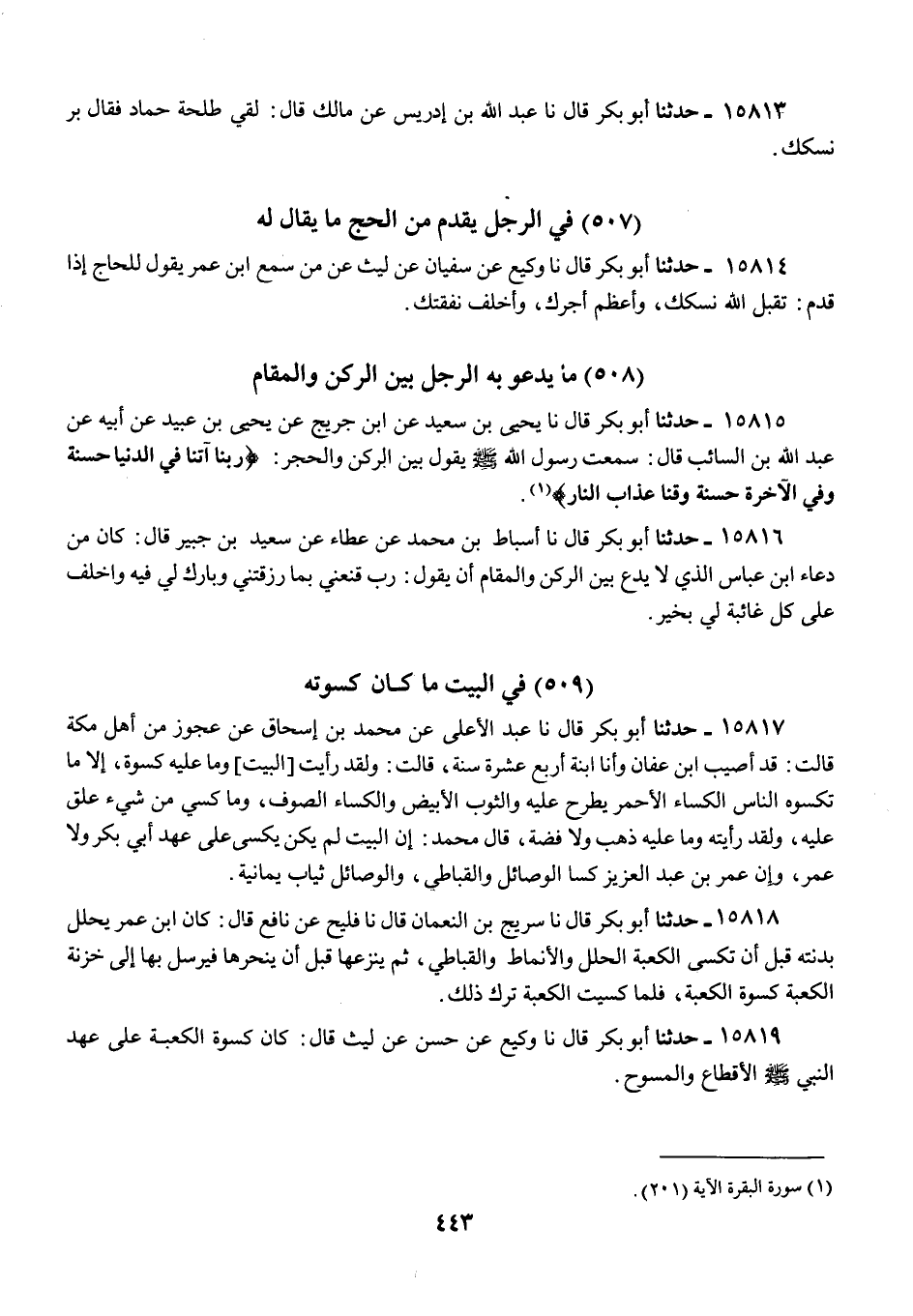 15819 - أَبُو بَكْرٍ قَالَ: نا وَكِيعٌ، عَنْ حَسَنٍ، عَنْ لَيْثٍ قَالَ: «§كَانَ كِسْوَةَ الْكَعْبَةِ عَلَى عَهْدِ النَّبِيِّ صَلَّى اللهُ عَلَيْهِ وَسَلَّمَ، الْأَقْطَاعُ وَالْمُسُوحُ»