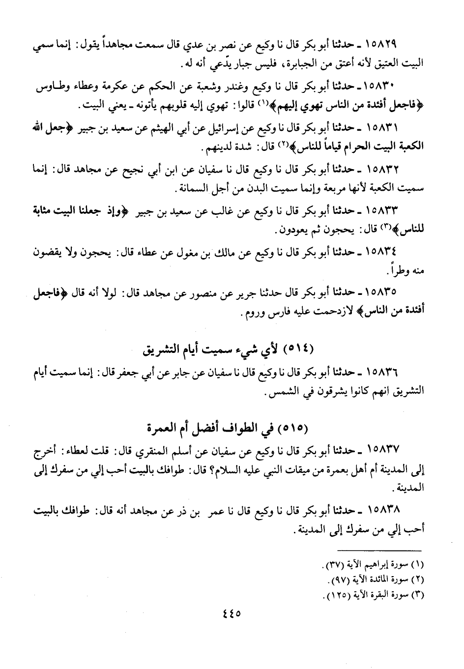 15830 - أَبُو بَكْرٍ قَالَ: نا وَكِيعٌ، وَغُنْدَرٌ، وَشُعْبَةُ، عَنِ الْحَكَمِ، عَنْ عِكْرِمَةَ، وَعَطَاءٍ، وَطَاوُسٍ: {§فَاجْعَلْ أَفْئِدَةً مِنَ النَّاسِ تَهْوِي إِلَيْهِمْ} [إبراهيم: 37] قَالُوا: «تَهْوِي إِلَيْهِ قُلُوبُهُمْ يَأْتُونَهُ» يَعْنِي الْبَيْتَ