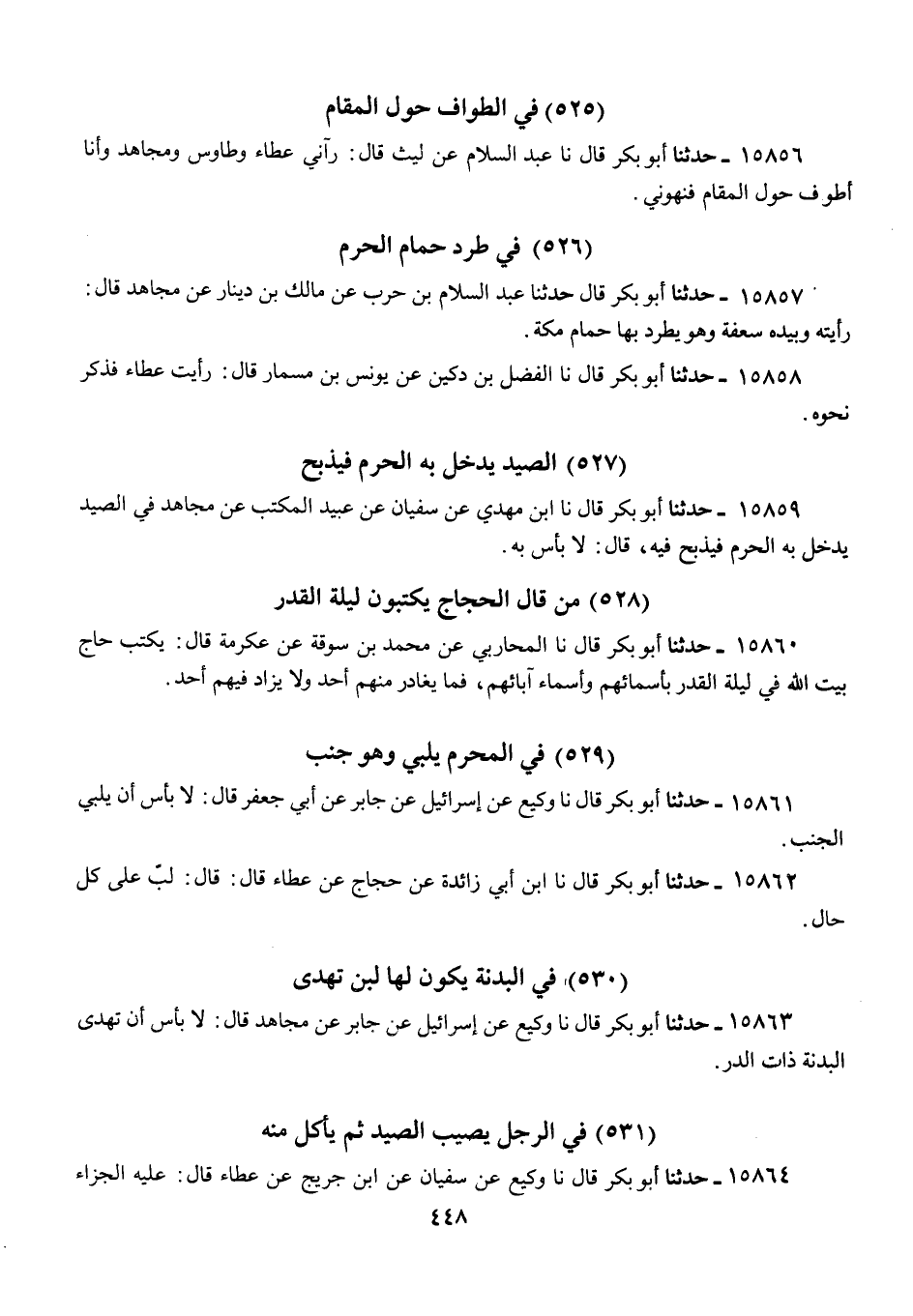 15862 - أَبُو بَكْرٍ قَالَ: نا ابْنُ أَبِي زَائِدَةَ، عَنْ حَجَّاجٍ، عَنْ عَطَاءٍ، قَالَ: «§لَبِّ عَلَى كُلِّ حَالٍ»