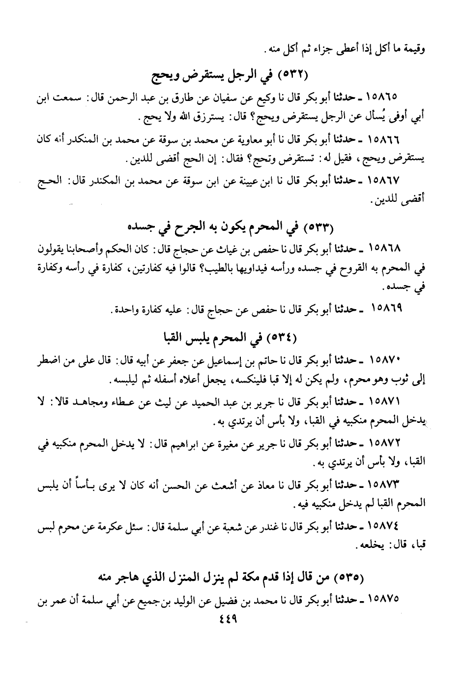 15872 - أَبُو بَكْرٍ قَالَ: نا جَرِيرٌ، عَنْ مُغِيرَةَ، عَنْ إِبْرَاهِيمَ قَالَ: «§لَا يَدْخُلُ الْمُحْرِمُ مَنْكِبَيْهِ فِي الْقَبَاءِ، وَلَا بَأْسَ أَنْ يَرْتَدِيَ بِهِ»