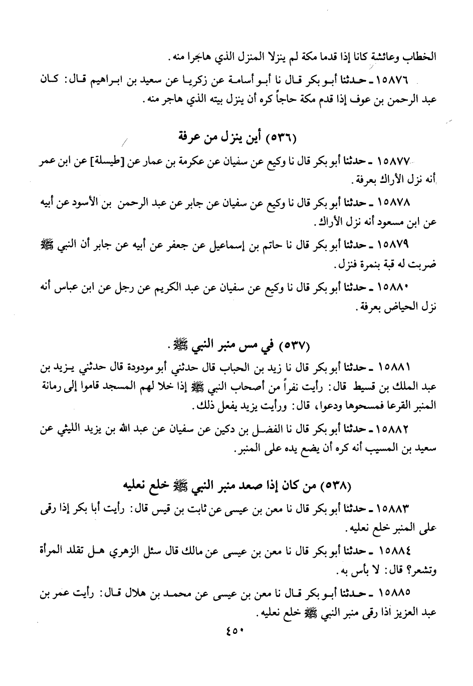 15880 - أَبُو بَكْرٍ قَالَ: نا وَكِيعٌ، عَنْ سُفْيَانَ، عَنْ عَبْدِ الْكَرِيمِ، عَنْ رَجُلٍ، عَنِ ابْنِ عَبَّاسٍ «أَنَّهُ §نَزَلَ الْحِيَاضَ بِعَرَفَةَ»