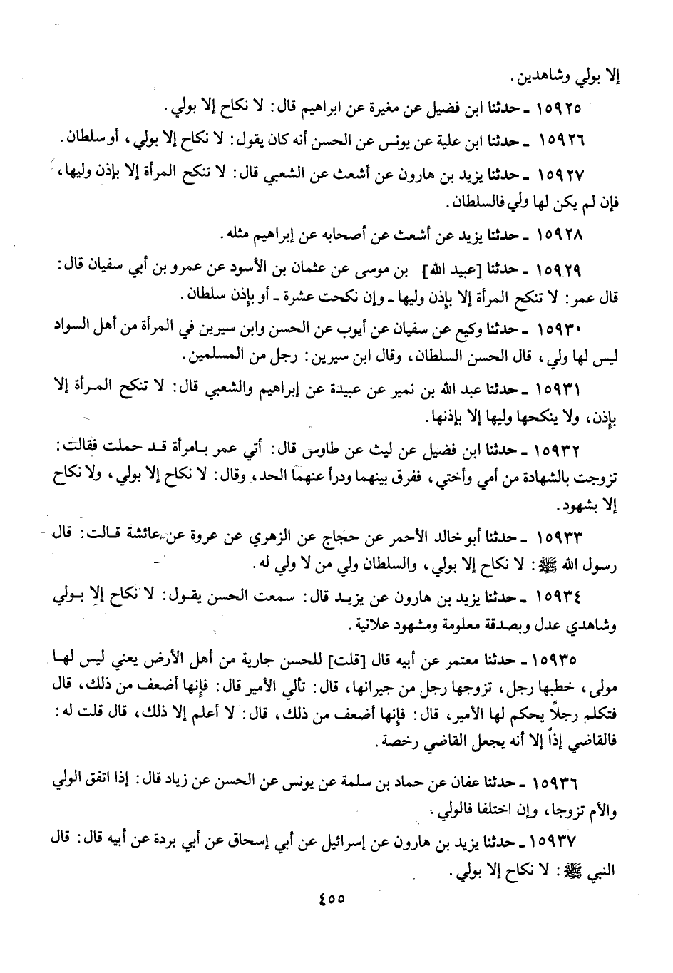15926 - ابْنُ عُلَيَّةَ، عَنْ يُونُسَ، عَنِ الْحَسَنِ، أَنَّهُ كَانَ يَقُولُ: «§لَا نِكَاحَ إِلَّا بِوَلِيٍّ، أَوْ سُلْطَانٍ»