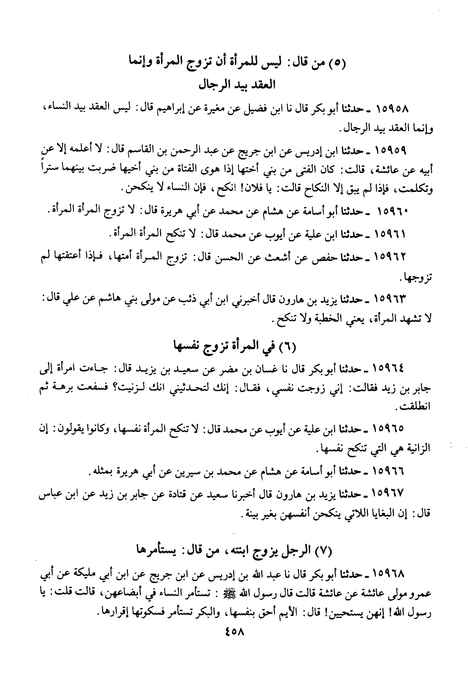 15958 - أَبُو بَكْرٍ قَالَ: نَا ابْنُ فُضَيْلٍ، عَنْ مُغِيرَةَ، عَنْ إِبْرَاهِيمَ، قَالَ: «§لَيْسَ الْعَقْدُ بِيَدِ النِّسَاءِ، وَإِنَّمَا الْعَقْدُ بِيَدِ الرِّجَالِ»