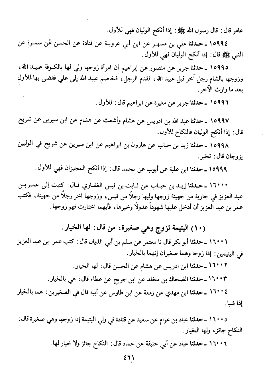 16001 - أَبُو بَكْرٍ قَالَ: نَا مُعْتَمِرٌ، عَنْ سَلْمِ بْنِ أَبِي الذَّيَّالِ، قَالَ: كَتَبَ عُمَرُ بْنُ عَبْدِ الْعَزِيزِ فِي §الْيَتِيمَيْنِ: «إِذَا زُوِّجَا وَهُمَا صَغِيرَانِ إِنَّهُمَا بِالْخِيَارِ»