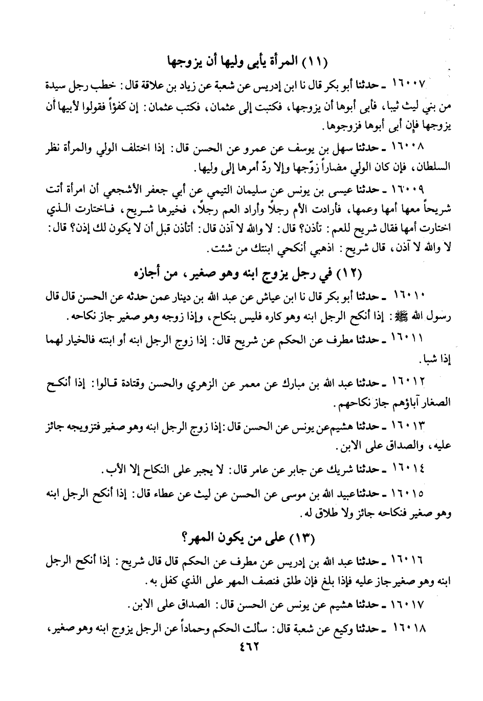 16018 - وَكِيعٌ، عَنْ شُعْبَةَ، قَالَ: سَأَلْتُ الْحَكَمَ، وَحَمَّادًا عَنِ الرَّجُلِ يُزَوِّجُ ابْنَهُ وَهُوَ صَغِيرٌ، قَالَ الْحَكَمُ: «عَلَى الِابْنِ»، وَقَالَ حَمَّادٌ: «هُوَ عَلَى الْأَبِ»، وَقَالَ قَتَادَةُ: قَالَ ابْنُ عُمَرَ: «§هُوَ عَلَى الَّذِي أَنْكَحْتُمُوهُ» ـ يَعْنِي الصَّدَاقَ عَلَى الِابْنِ ـ