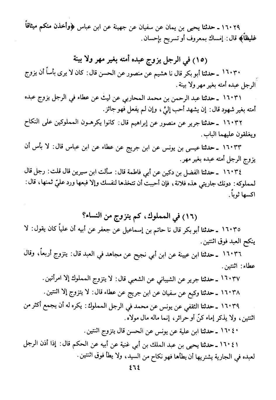 16037 - جَرِيرٌ، عَنِ الشَّيْبَانِيِّ، عَنِ الشَّعْبِيِّ، قَالَ: «§لَا يَتَزَوَّجُ الْمَمْلُوكُ إِلَّا امْرَأَتَيْنِ»