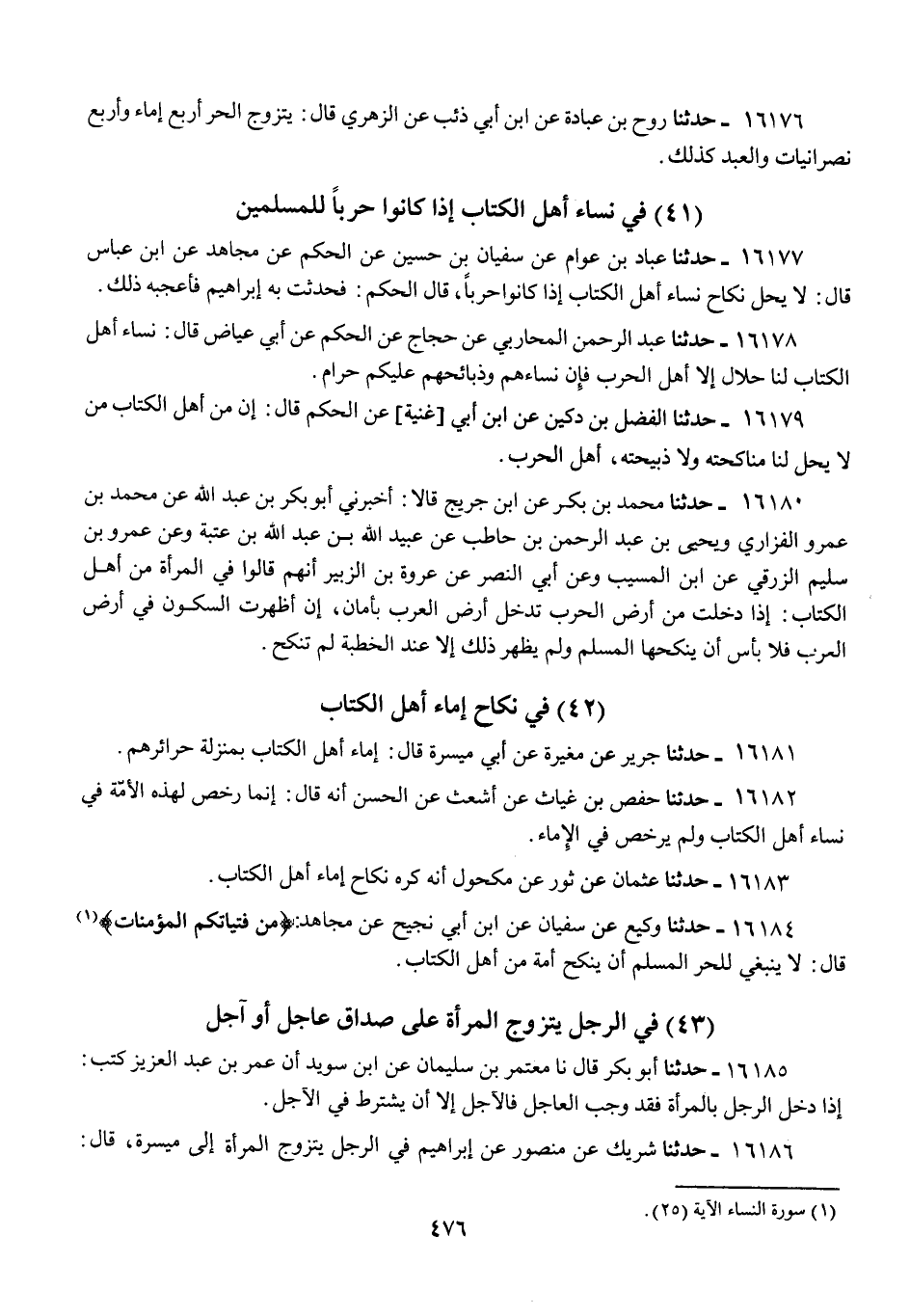 16184 - وَكِيعٌ، عَنْ سُفْيَانَ، عَنِ ابْنِ أَبِي نَجِيحٍ، عَنْ مُجَاهِدٍ، {مِنْ فَتَيَاتِكُمُ الْمُؤْمِنَاتِ} [النساء: 25]، قَالَ: «§لَا يَنْبَغِي لِلْحُرِّ الْمُسْلِمِ أَنْ يَنْكِحَ أَمَةً مِنْ أَهْلِ الْكِتَابِ»