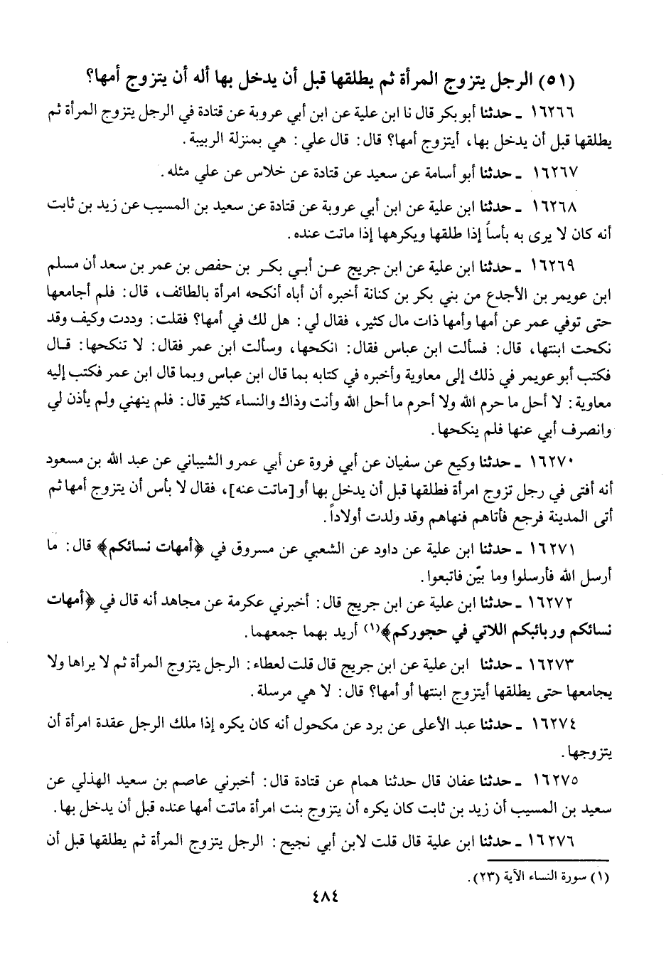16277 - عَلِيُّ بْنُ مُسْهِرٍ، عَنْ سَعِيدٍ، عَنْ قَتَادَةَ، عَنِ الْحَسَنِ، عَنْ عِمْرَانَ بْنِ الْحُصَيْنِ فِي §أُمَّهَاتِ نِسَائِكُمْ قَالَ: «هِيَ مُبْهَمَةٌ»