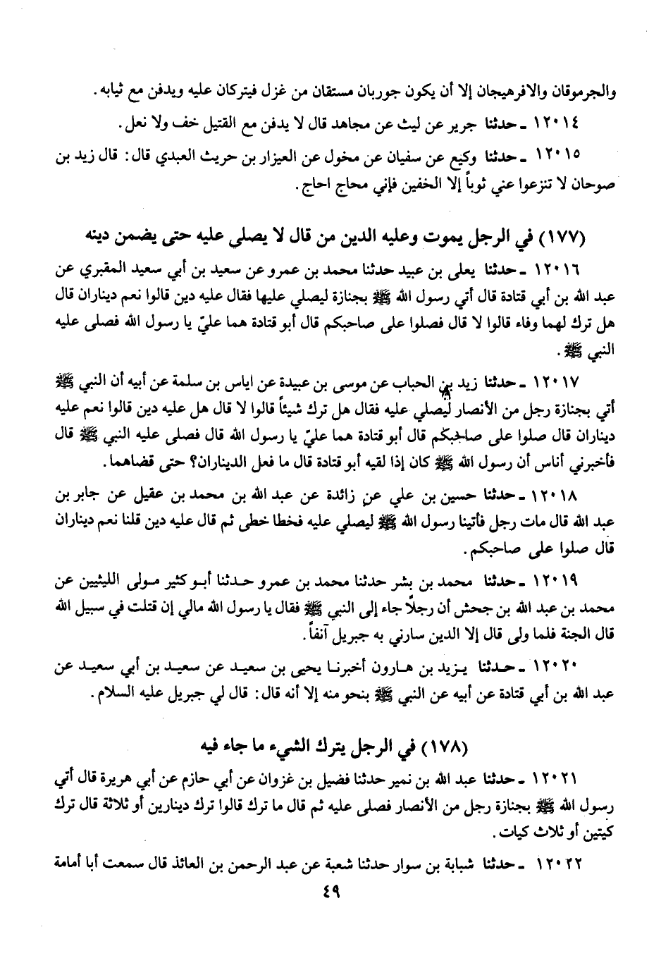 12018 - حَدَّثَنَا حُسَيْنُ بْنُ عَلِيٍّ، عَنْ زَائِدَةَ، عَنْ عَبْدِ اللَّهِ بْنِ مُحَمَّدِ بْنِ عَقِيلٍ، عَنْ جَابِرِ بْنِ عَبْدِ اللَّهِ، قَالَ: مَاتَ رَجُلٌ فَأَتَيْنَا رَسُولَ اللَّهِ صَلَّى اللهُ عَلَيْهِ وَسَلَّمَ، لِيُصَلِّيَ عَلَيْهِ فَخَطَا خُطًى، قَالَ: «§عَلَيْهِ دَيْنٌ؟» قُلْنَا: نَعَمْ عَلَيْهِ دِينَارَانِ، قَالَ: «صَلُّوا عَلَى صَاحِبِكُمْ»