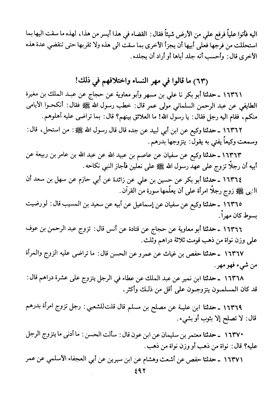 16365 - وَكِيعٌ، عَنْ سُفْيَانَ، عَنْ إِسْمَاعِيلَ، عَنْ أَبِيهِ، عَنْ سَعِيدِ بْنِ الْمُسَيِّبِ، قَالَ: «§لَوْ رَضِيَتْ بِسَوْطٍ كَانَ مَهْرًا»