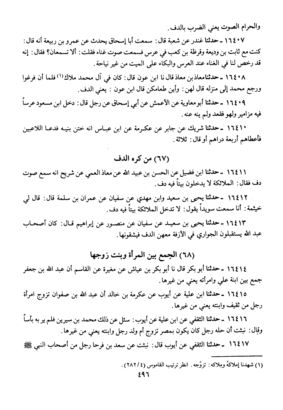 16412 - يَحْيَى بْنُ سَعِيدٍ، وَابْنُ مَهْدِيٍّ، عَنْ سُفْيَانَ، عَنْ عِمْرَانَ بْنِ سَلَمَةَ، قَالَ: قَالَ لِي خَيْثَمَةُ: أَنَا سَمِعْتُ سُوَيْدًا، يَقُولُ: «§لَا تَدْخُلُ الْمَلَائِكَةُ بَيْتًا فِيهِ دُفٌّ»