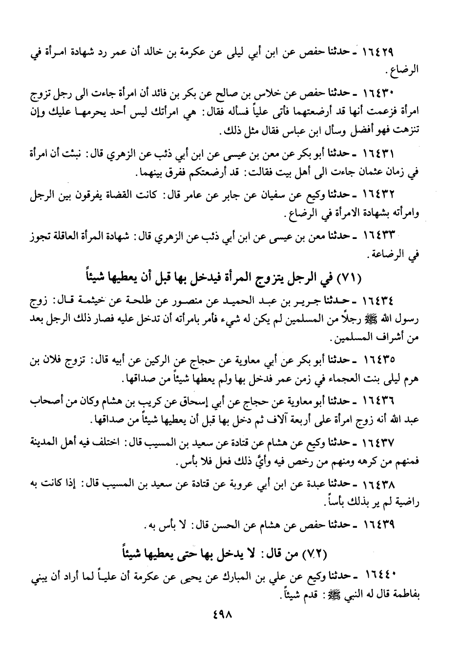 16436 - أَبُو مُعَاوِيَةَ، عَنْ حَجَّاجٍ، عَنْ أَبِي إِسْحَاقَ، عَنْ كُرَيْبِ بْنِ هِشَامٍ، وَكَانَ مِنْ أَصْحَابِ عَبْدِ اللَّهِ أَنَّهُ «§زَوَّجَ امْرَأَةً عَلَى أَرْبَعَةِ آلَافٍ، ثُمَّ دَخَلَ بِهَا قَبْلَ أَنْ يُعْطِيَهَا شَيْئًا مِنْ صَدَاقِهَا»