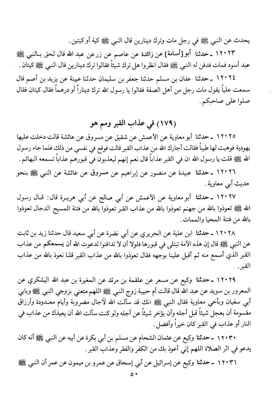 12025 - حَدَّثَنَا أَبُو مُعَاوِيَةَ، عَنِ الْأَعْمَشِ، عَنْ شَقِيقٍ، عَنْ مَسْرُوقٍ، عَنْ عَائِشَةَ، قَالَتْ: دَخَلَتْ عَلَيْهَا يَهُودِيَّةٌ فَوَهَبَتْ لَهَا طِيبًا، فَقَالَتْ: أَجَارَكَ اللَّهُ مِنْ عَذَابِ الْقَبْرِ، قَالَتْ: فَوَقَعَ فِي نَفْسِي مِنْ ذَلِكَ، فَلَمَّا جَاءَ رَسُولُ اللَّهِ صَلَّى اللهُ عَلَيْهِ وَسَلَّمَ قُلْتُ: يَا رَسُولَ اللَّهِ إِنَّ فِي الْقَبْرِ عَذَابًا؟ قَالَ: «نَعَمْ، إِنَّهُمْ §لَيُعَذَّبُونَ فِي قُبُورِهِمْ عَذَابًا تَسْمَعُهُ الْبَهَائِمُ»