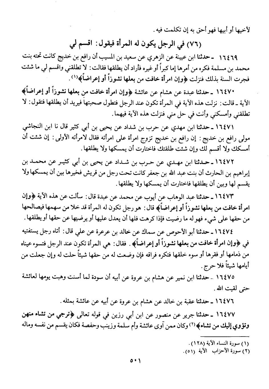 16469 - ابْنُ عُيَيْنَةَ، عَنِ الزُّهْرِيِّ، عَنْ سَعِيدِ بْنِ الْمُسَيِّبِ، أَنَّ رَافِعَ بْنَ خَدِيجٍ كَانَتْ تَحْتَهُ بِنْتُ مُحَمَّدِ بْنِ مَسْلَمَةَ، فَكَرِهَ مِنْ أَمْرِهَا إِمَّا كِبَرًا أَوْ غَيْرَهُ، فَأَرَادَ أَنْ يُطَلِّقَهَا، فَقَالَتْ: §لَا تُطَلِّقْنِي وَاقْسِمْ لِي مَا شِئْتَ فَجَرَتِ السُّنَّةُ بِذَلِكَ فَنَزَلَتْ: {وَإِنِ امْرَأَةٌ خَافَتْ مِنْ بَعْلِهَا نُشُوزًا أَوْ إِعْرَاضًا} [النساء: 128]