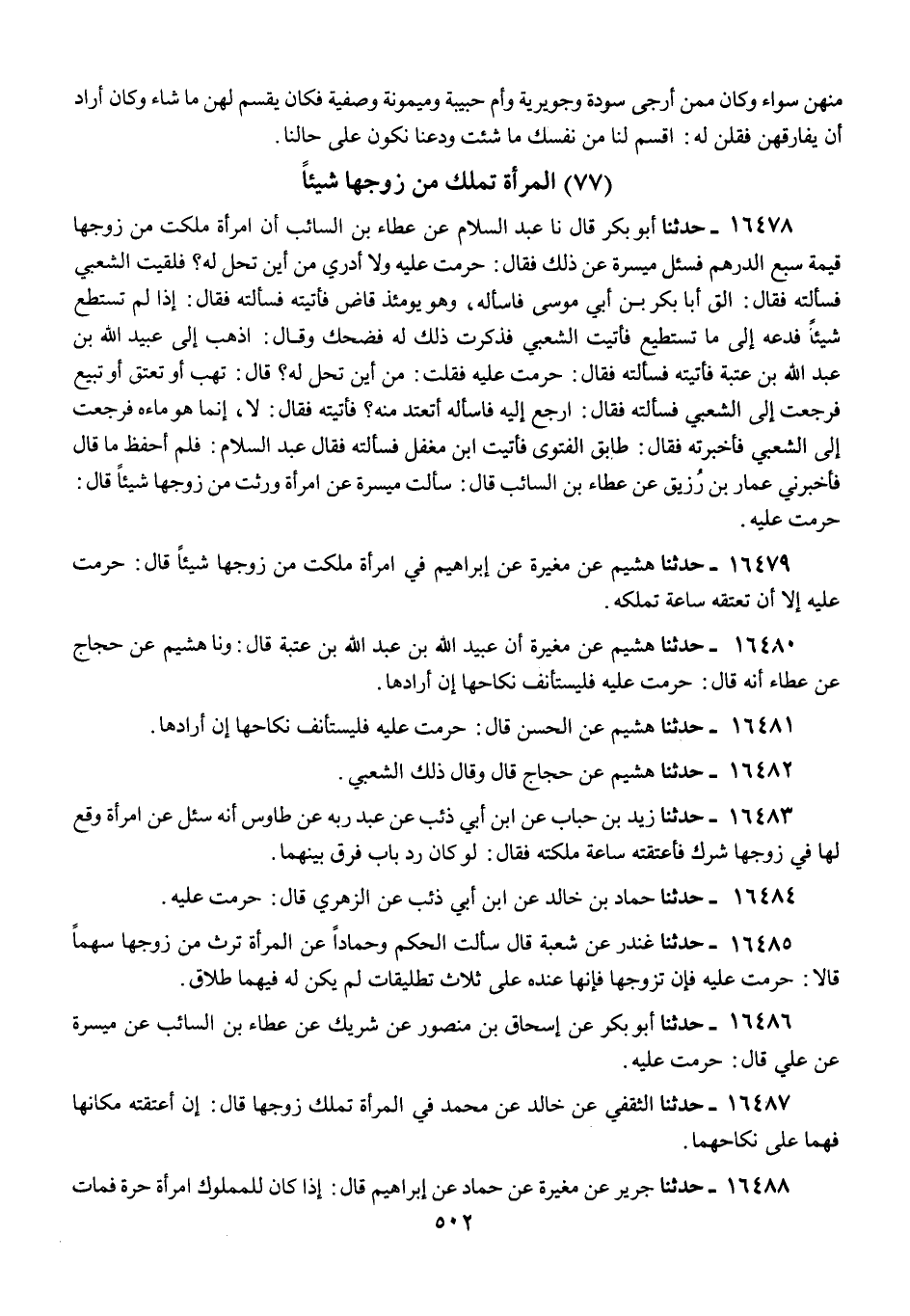16478 - أَبُو بَكْرٍ قَالَ: نَا عَبْدُ السَّلَامِ، عَنْ عَطَاءِ بْنِ السَّائِبِ، أَنَّ §امْرَأَةً مَلَكَتْ مِنْ زَوْجِهَا قِيمَةَ سُبُعِ الدِّرْهَمِ فَسُئِلَ مَيْسَرَةُ عَنْ ذَلِكَ، فَقَالَ: «حَرُمَتْ عَلَيْهِ وَلَا أَدْرِي مِنْ أَيْنَ تَحِلُّ لَهُ؟» فَلَقِيتُ الشَّعْبِيَّ فَسَأَلْتُهُ فَقَالَ: الْقَ أَبَا بَكْرِ بْنَ أَبِي مُوسَى فَاسْأَلْهُ، وَهُوَ يَوْمَئِذٍ قَاضٍ، فَأَتَيْتُهُ فَسَأَلْتُهُ فَقَالَ: «إِذَا لَمْ تَسْتَطِعْ شَيْئًا فَدَعْهُ إِلَى مَا تَسْتَطِيعُ» فَأَتَيْتُ الشَّعْبِيَّ فَذَكَرْتُ ذَلِكَ لَهُ فَضَحِكَ، وَقَالَ: اذْهَبْ إِلَى عُبَيْدِ اللَّهِ بْنِ عَبْدِ اللَّهِ بْنِ عُتْبَةَ، فَأَتَيْتُهُ فَسَأَلْتُهُ فَقَالَ: «حَرُمَتْ عَلَيْهِ» فَقُلْتُ: مِنْ أَيْنَ تَحِلُّ لَهُ؟ قَالَ: «تَهَبُ أَوْ تُعْتِقُ أَوْ تَبِيعُ»، فَرَجَعْتُ إِلَى الشَّعْبِيِّ فَسَأَلْتُهُ فَقَالَ: «ارْجِعْ إِلَيْهِ فَاسْأَلْهُ أَتَعْتَدُّ مِنْهُ؟» فَأَتَيْتُهُ فَقَالَ: لَا، إِنَّمَا هُوَ مَاؤُهُ، فَرَجَعْتُ إِلَى الشَّعْبِيِّ، فَأَخْبَرْتُهُ فَقَالَ: «طَابَقَ الْفَتْوَى» فَأَتَيْتُ ابْنَ مُغَفَّلٍ فَسَأَلْتُهُ، فَقَالَ عَبْدُ السَّلَامِ: فَلَمْ أَحْفَظْ مَا قَالَ، فَأَخْبَرَنِي عَمَّارُ بْنُ رُزَيْقٍ، عَنْ عَطَاءِ بْنِ السَّائِبِ، قَالَ: سَأَلْتُ مَيْسَرَةَ عَنِ امْرَأَةٍ وَرِثَتْ مِنْ زَوْجِهَا شَيْئًا قَالَ: «حَرُمَتْ عَلَيْهِ»