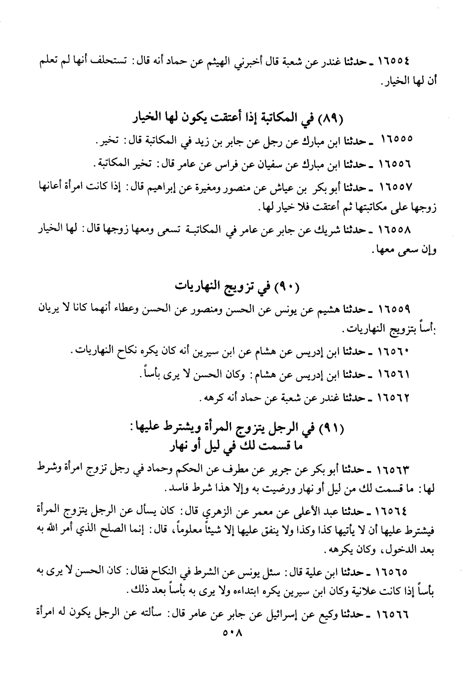 16563 - أَبُو بَكْرٍ عَنْ جَرِيرٍ، عَنْ مُطَرِّفٍ، عَنِ الْحَكَمِ، وَحَمَّادٍ «فِي §رَجُلٍ تَزَوَّجَ امْرَأَةً وَشَرَطَ لَهَا مَا قَسَمْتُ لَكَ مِنْ لَيْلٍ، أَوْ نَهَارٍ، وَرَضِيَتْ بِهِ، وَإِلَّا هَذَا شَرْطٌ فَاسِدٌ»